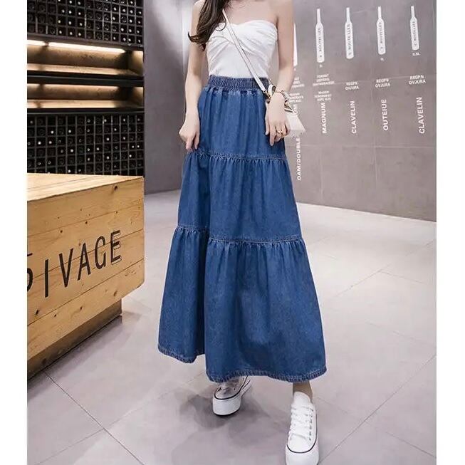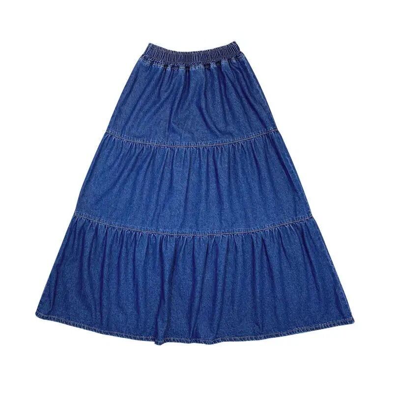 デニム素材のティアードスカートは、上品かつカジュアルなコーディネートにぴったり。