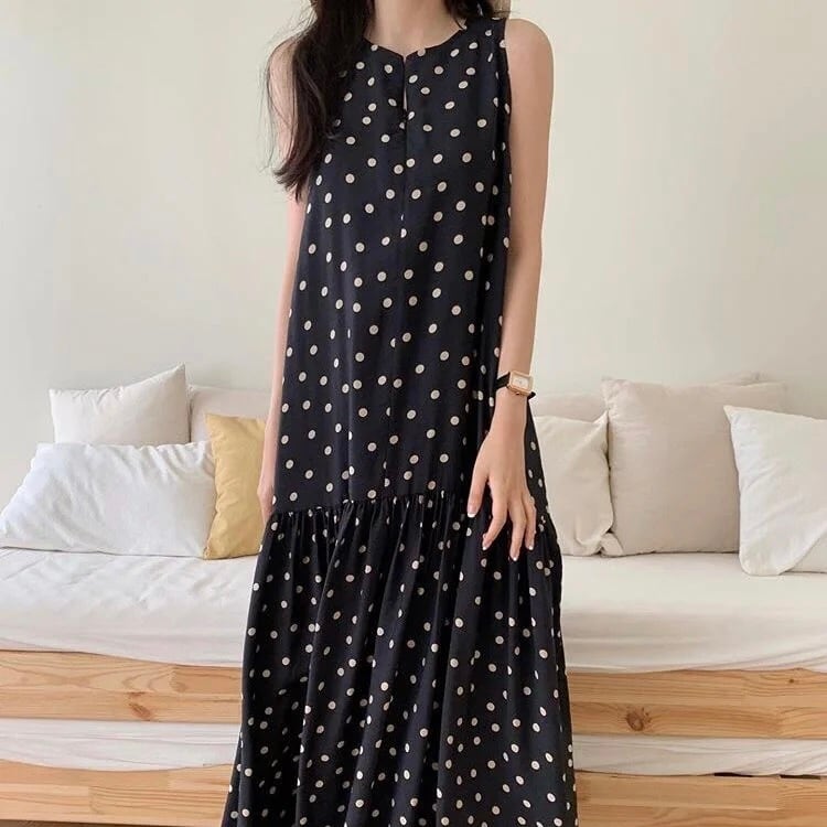 鮮やかなドット柄と女性らしいシルエットが魅力の、裾切り替えワンピースです。